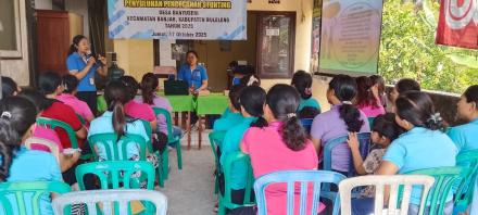 Kegiatan ini dihadiri oleh 35 orang kader kesehatan dengan 2 orang narasumber dari Puskesmas Banjar I dan resmi dibuka oleh Bapak Sekretaris Desa. Kegiatan ini dimulai pukul 09.00 wita sampai selesai.