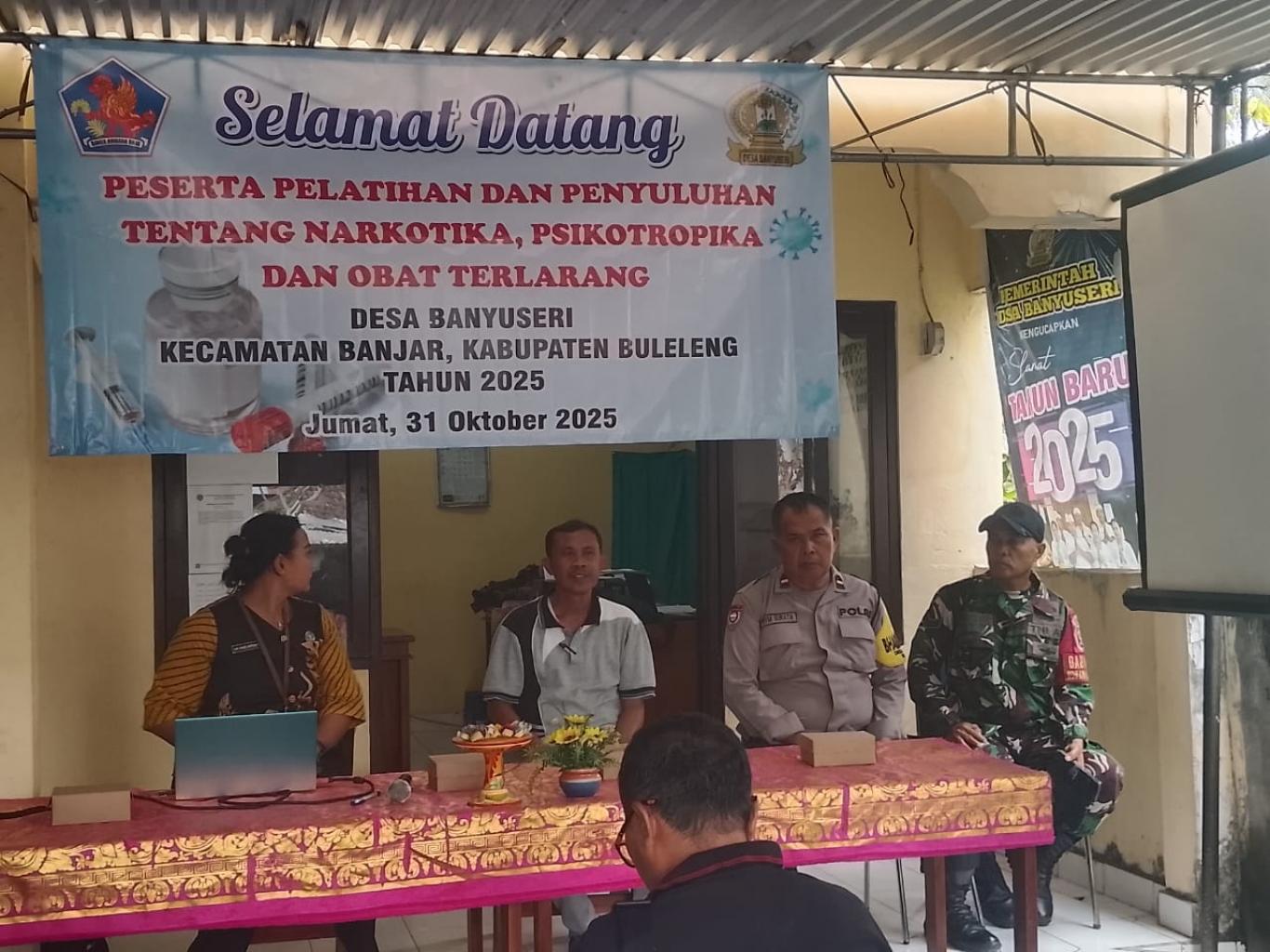 Jumat, 31 Oktober 2025 Pemerintah Desa Banyuseri mengadakan penyuluhan tentang bahaya Narkoba dengan Narasumber dari Badan Narkotika Nasional (BPN) kabupaten Buleleng yang didampingi oleh Sekretaris Desa Banyuseri Babhinkamtibmas, Babinsa dengan peserta bejumlah 27 orang. Kegiatan ini mengambil tempat di Kantor Perbekel sementara.